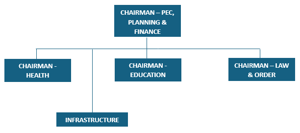 The Executive Government is the Provincial Executive Council (PEC) which the Governor is the Chairman. The PEC comprises of the five (5) chairmen leading different sectors including Health, Education, Infrastructure, Law & Order, and Planning & Finance. Refer to the diagram below: